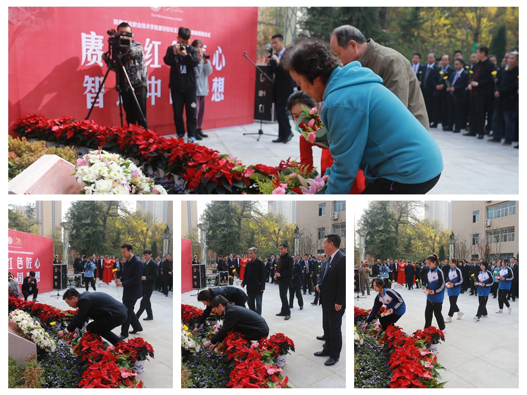 在庄严的《献花曲》音乐声中,国旗护卫队的同学代表学院党委行政和历届师生向王达成同志雕像敬献花环,参加揭幕仪式师生依次向王达成同志雕像献花。仪式最后,学院领导向学生代表赠送纪念了建校70周年系列资料之《王达成传记》。