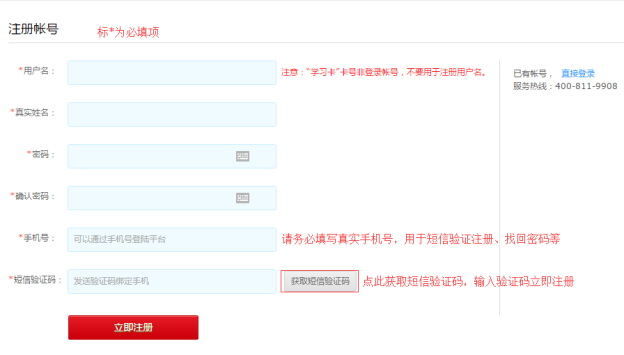 在注册页面逐步填写真实准确信息完成注册。如果手机未收到短信验证码,请点击“重新获取验证码”,如果不行请拨打4008119908或在线咨询学员服务老师。