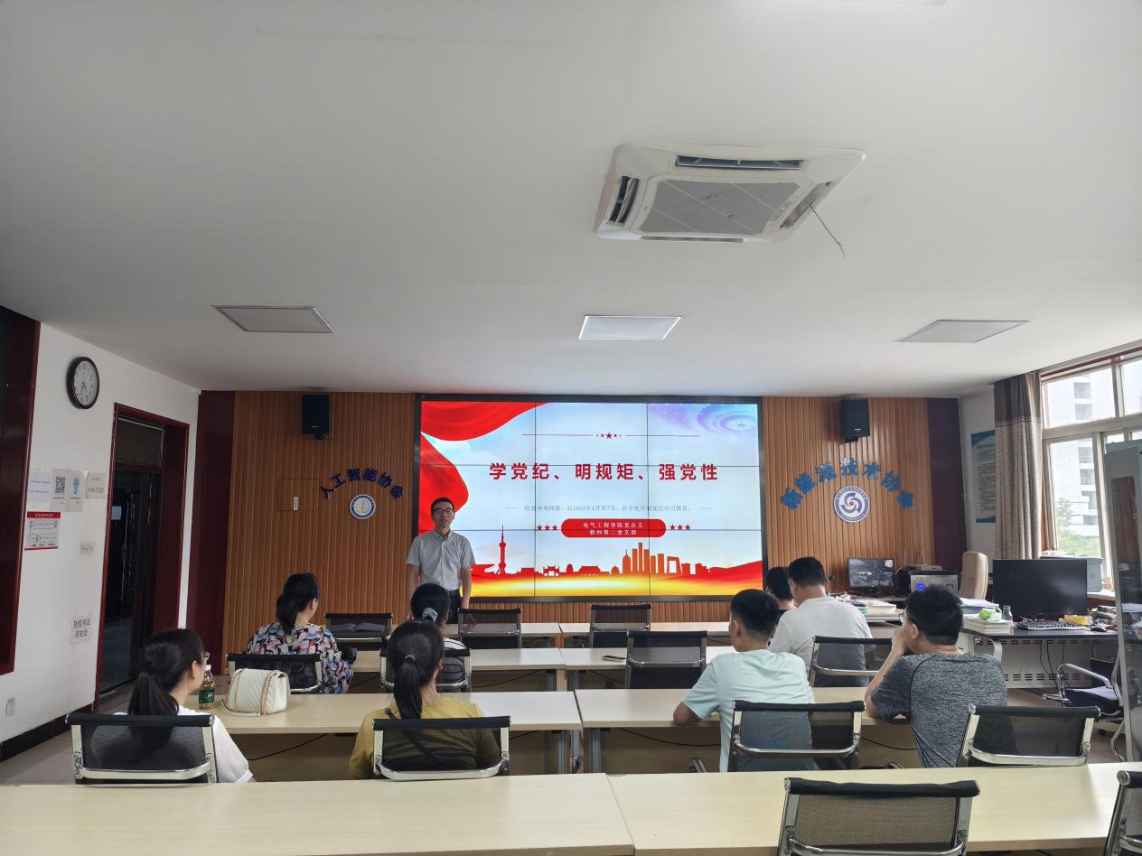 在七一建党节来临之际,为进一步深化党纪学习教育,增强党员的纪律意识和规矩意识,引导全体党员学纪、知纪、明纪、守纪,6月26日下午,电气工程学院党总支教师第二党支部在行知楼A410开展以“学党纪、明规矩、强党性”为主题的支部书记讲党课活动,教师第二支部全体党员参加了本次活动。